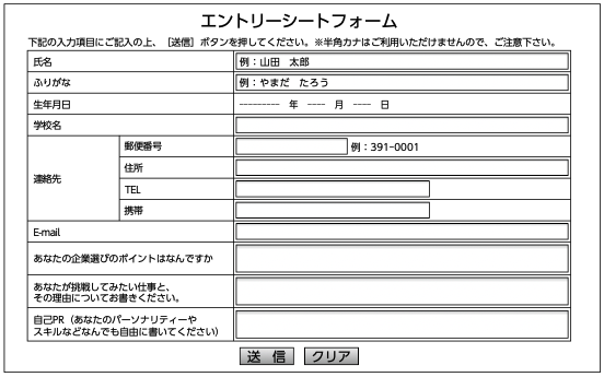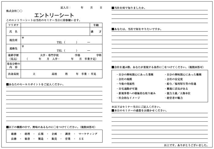 最初にエントリーシートの形式を学生に見せておき、イメージさせるのもよいでしょう。一般的な形式は、以下のとおりです。
