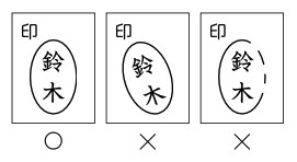 ネーム印やスタンプ印は不可です。朱肉を使用する印鑑を使いましょう。三文判でも問題ありません。傾きやかすれに注意し、枠内の中心に鮮明に押印します。