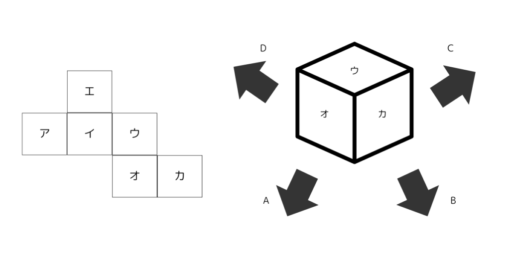 以下の展開図の立方体をB→A→Dの指示された方向に回転させたとき、回転後の上の面に出るものはどれか。
