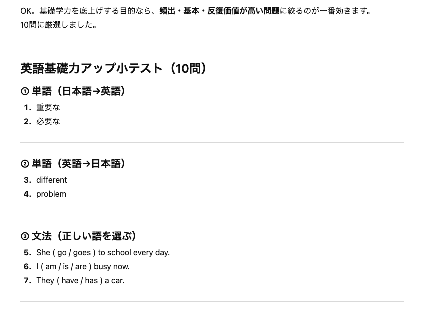 小テストや単語テストなど、日常的に実施する簡単な問題はChatGPTに任せてみましょう。次章で実際の作成例も紹介するので参考にしてください。