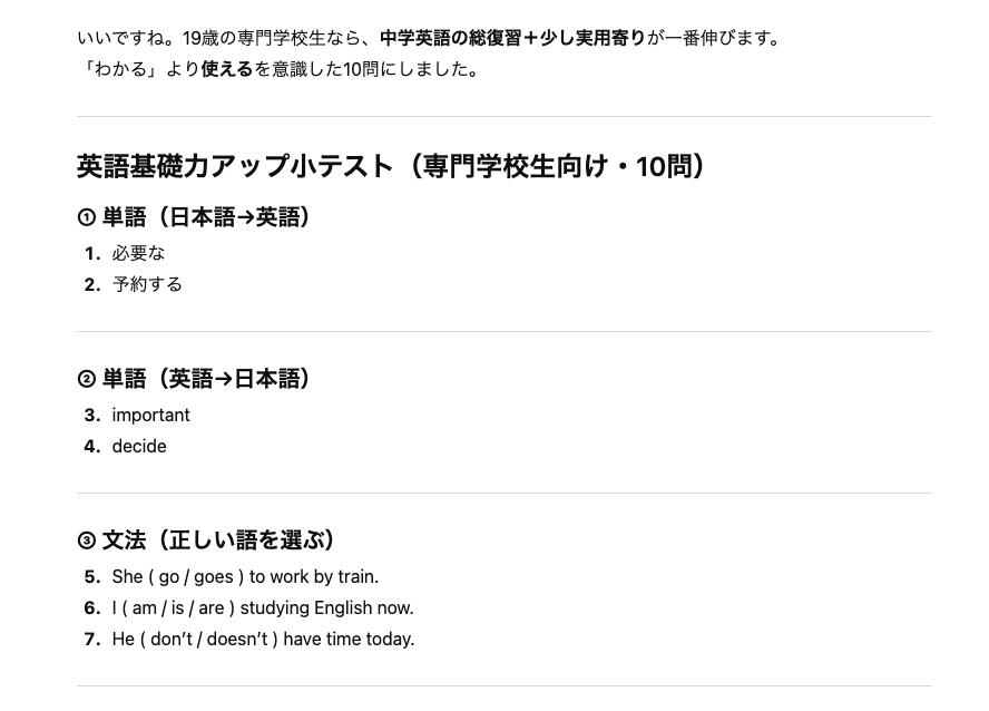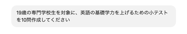 上記のように、10問の問題が作成されました。続いて「専門学校生向け」という条件を追加して依頼します。