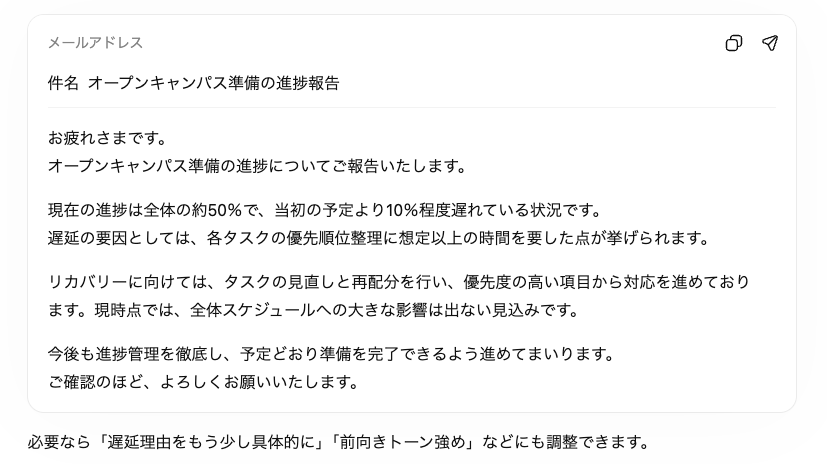 さらに、トーンの提案もしてくれるため、「遅延理由をもう少し具体的に」「前向きトーン強め」といった希望に応じて表現を調整できる点も便利です。