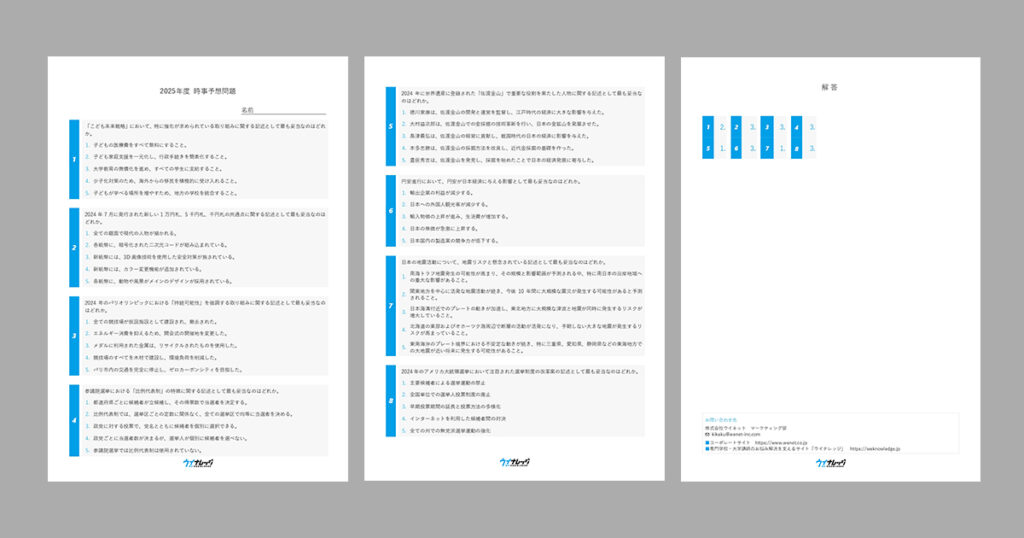 「【公務員試験】時事問題の傾向と2025年度のポイント」を執筆いただいた「豊橋創造大学 公務員試験支援センター」の伊藤圭一先生が作成した「【公務員試験】2025年度時事予想問題」を、小テストとしてお使いいただけるような形でPDFファイルにいたしました。