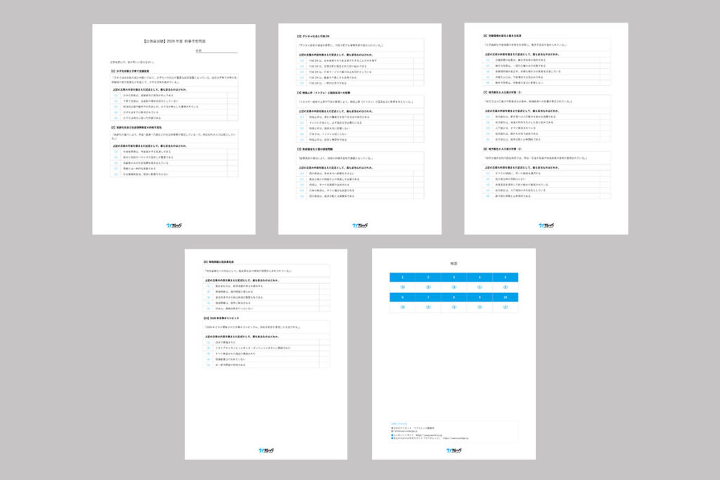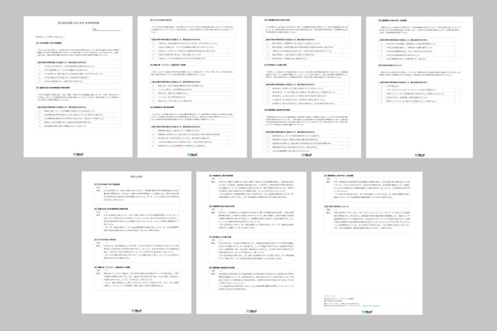 「【公務員試験】時事問題の重要性と2026年度のポイント」を執筆いただいた「豊橋創造大学 公務員試験支援センター」の伊藤圭一先生が作成した「【公務員試験】2026年度 時事練習問題」と「【公務員試験】2026年度 時事予想問題」を、小テストとしてお使いいただけるような形でPDFファイルにいたしました。