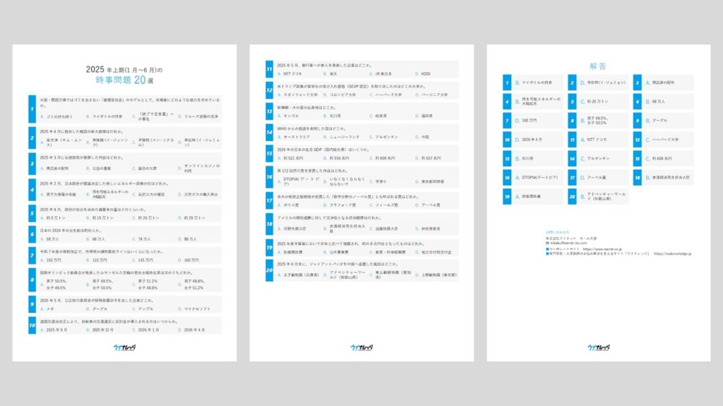 ウイナレッジでは、2025年上期(1月~6月)の時事問題20問を新たに作成し、小テストとしてお使いいただけるような形でPDFファイルにいたしました。