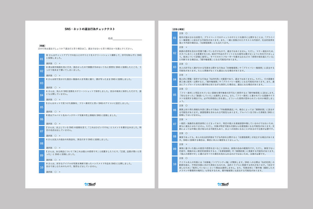 SNSやインターネット上で、どのような行為が違法になるのかについて、学生がどの程度理解しているかを確認できます。どこまでが合法で、どこからが違法になるのかを整理した解説も付いています。
