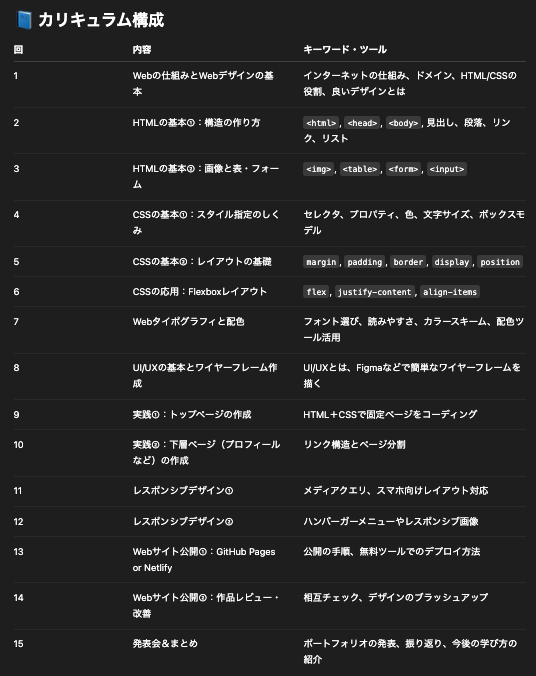 たとえば「Webデザイン基礎」という授業のシラバスを考えたい場合、生成AIに「初学者向けに週1回×15コマでWebデザインを教えるカリキュラムを作って」と指示すれば、おおまかな構成案が即座に提示されます。