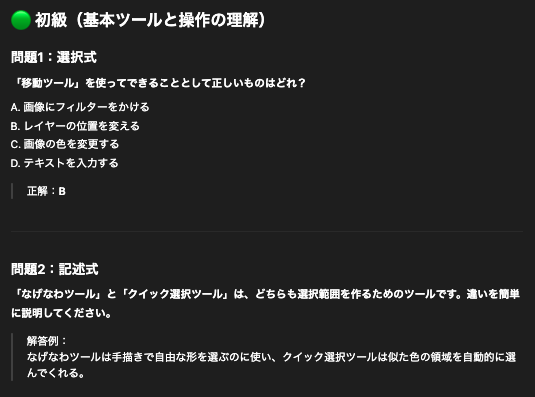 たとえば「Photoshopのツールを理解するための問題を、初級・中級・上級の3レベルでそれぞれ2問ずつ作って」と指示すれば、瞬時に各レベルの問題を作成してくれます。誤答例や解説付きの模範解答も生成できるため、添削のガイドライン作成にも役立つでしょう。