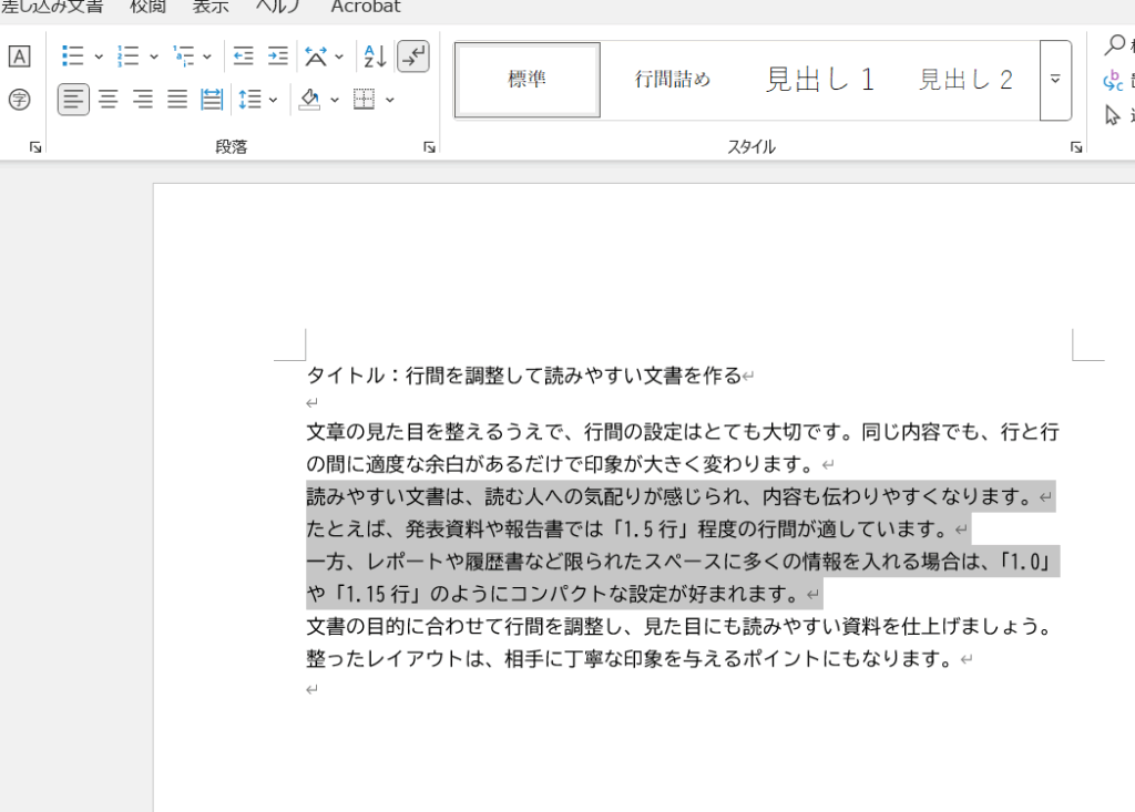 行間を調整すると紙面全体の印象が引き締まり、読みやすさが増します。行のあいだに適度な余白があるだけで文字が詰まりすぎず、落ち着いた雰囲気の資料に仕上がるのです。