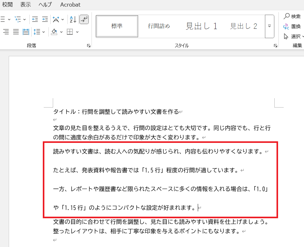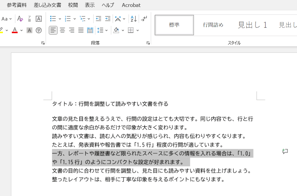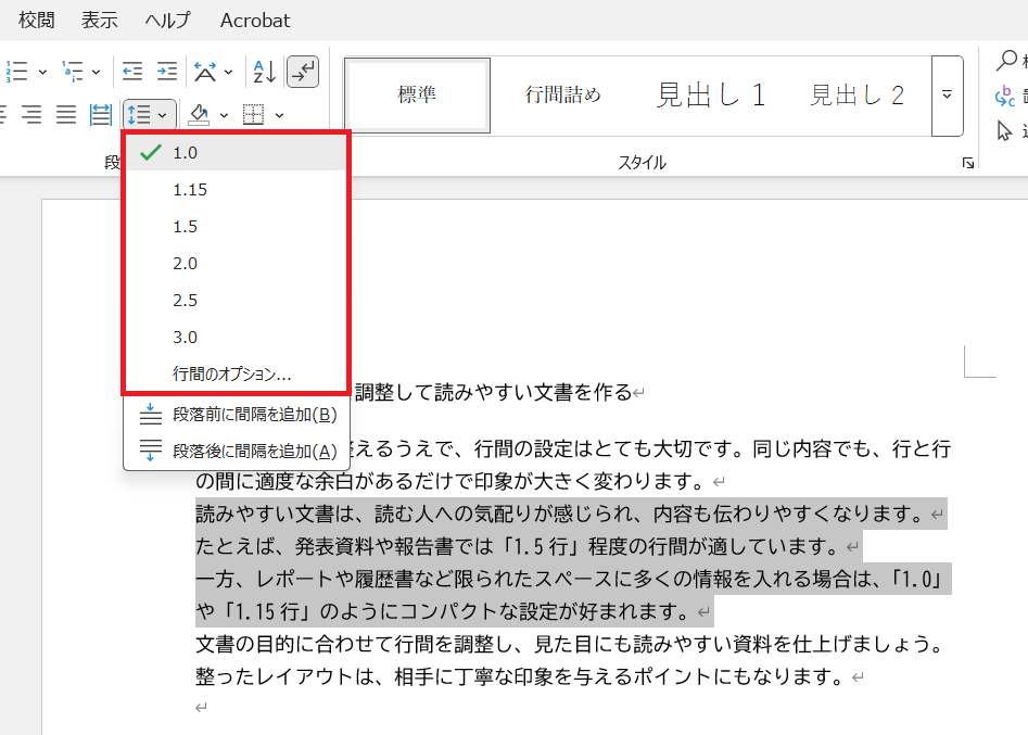 希望する数値をクリックすると、選択した範囲に反映されます。履歴書やレポートなどは「1.0〜1.5」、読みやすさを重視する資料やスライドでは「1.5〜2.0」が目安です。