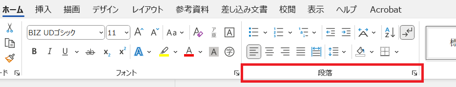 ホームタブの「段落」グループ右下にある矢印アイコンをクリックします。