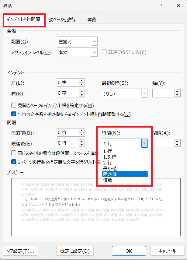 設定を変えたのに行間が詰まらない場合は「行間」の種類が「最小値」になっているからかもしれません。この設定だと、文字サイズに応じて行間が自動で調整されるため、思ったより広く見えることがあります。「インデントと行間隔」の中にある「行間」を「最小値」から「固定値」に変更し、「間隔」に希望の数値を入力しましょう。