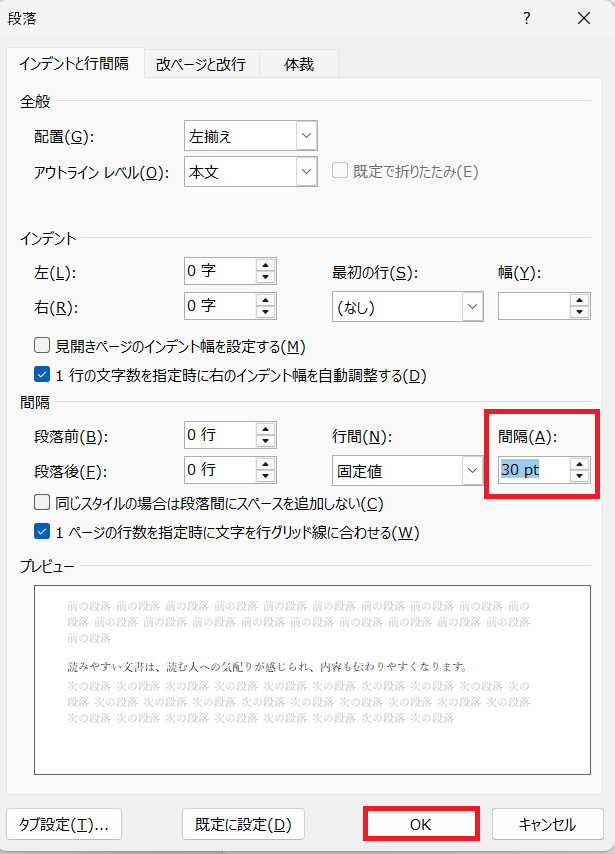4. 「行間」を「固定値」に設定する