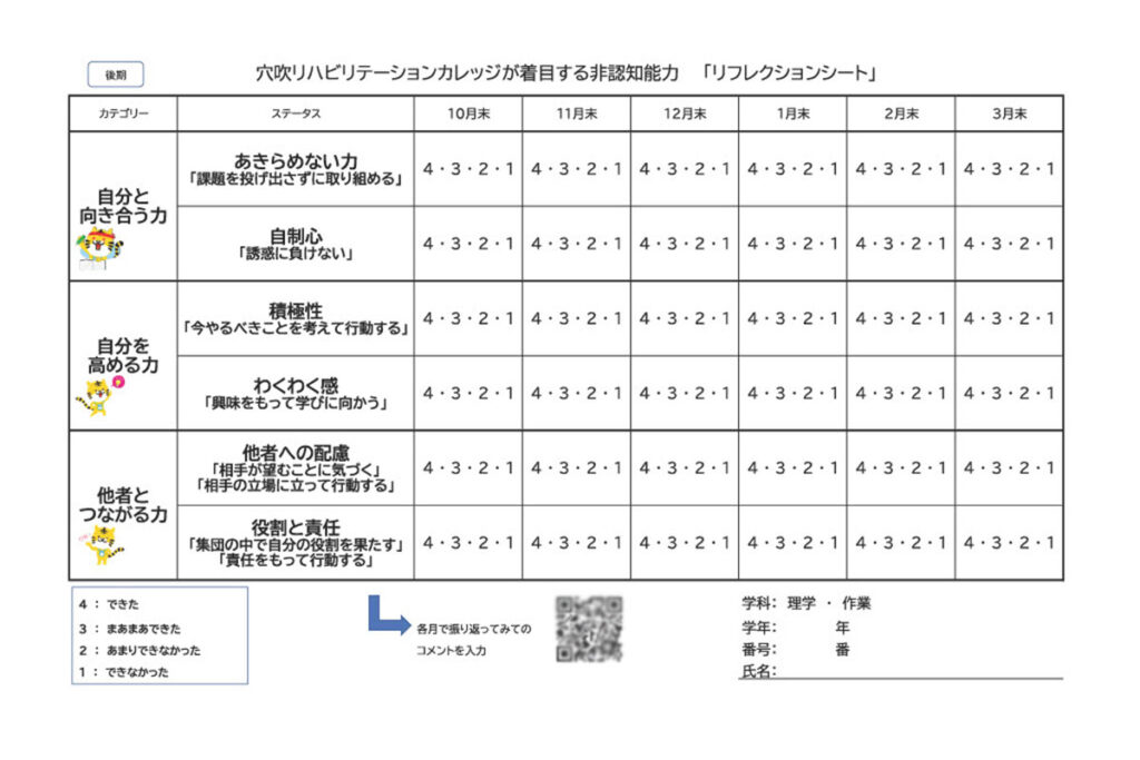 馬場先生:取り組みを開始した当初は、穴吹学園全体で掲げた15項目の「非認知能力キーワード」をもとに、Googleフォームを活用したリフレクションシートを用意し、学生自身に行動を振り返ってもらい、4段階評価をつけてもらう方法を実施しました。4段階でチェックするだけなので、学生にとって負担が少ない反面、適当になってしまう懸念もありましたが、まずは「非認知能力に関するキーワードを学生に目にしてもらうこと」を目的にスタートしました。
