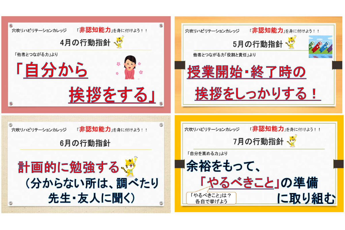 2つ目は、「今月の行動指針」として、「自分から挨拶する」「計画的に勉強する」といった非認知能力に基づく具体的な目標を毎月設定し、全学生が共通して意識できるようにしていることです。下駄箱や教室にポスターを貼り、学生へのメッセージツールでも発信することで、常に目標が目に入る環境を作っています。