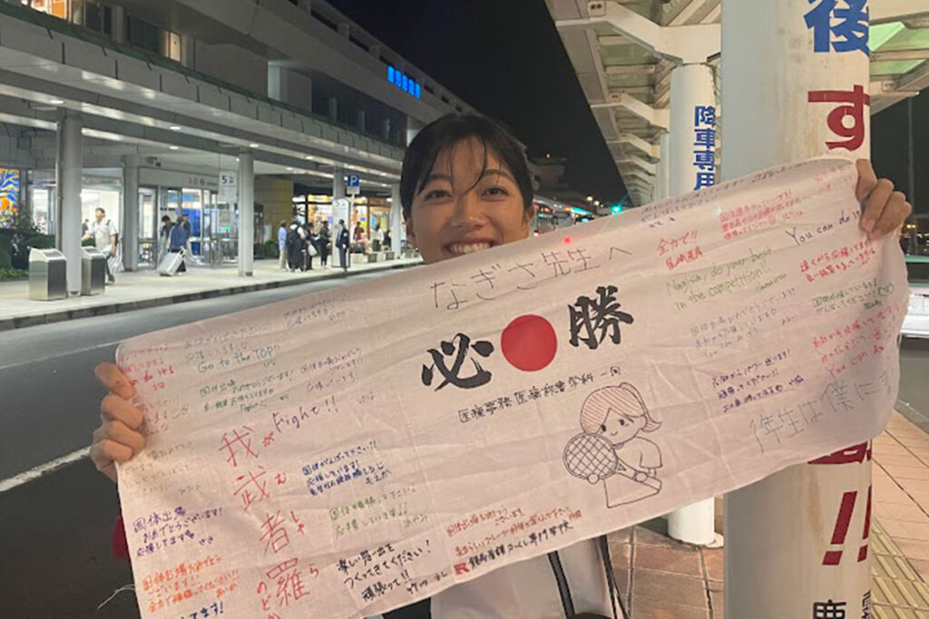 先生方や学生のみんなもとても応援してくれていて、国体前にはメッセージを書いた鉢巻きをプレゼントしてくれました。試合で数日間不在にする際には、ほかの先生が私のクラスを見てくださったり、学科を越えて声をかけていただいたりと、多くの協力をいただいています。働きやすい環境に感謝しています。